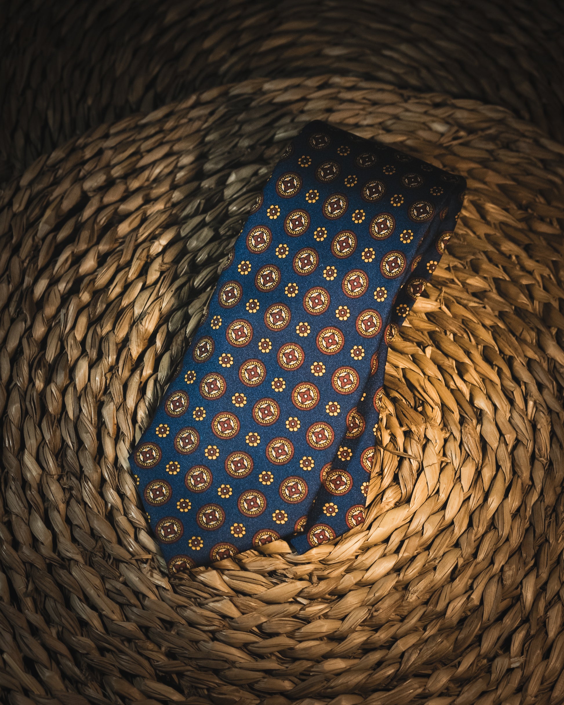 Corbata de corte clásico con estampados geométricos en tonos rojo rubí y amarillo albero sobre fondo azul añil.